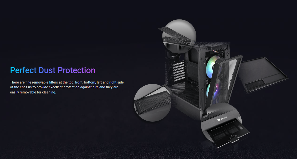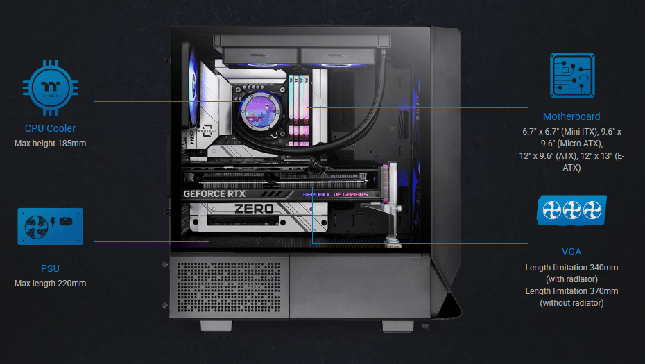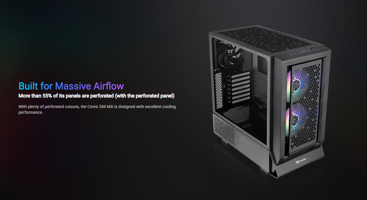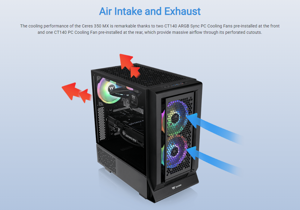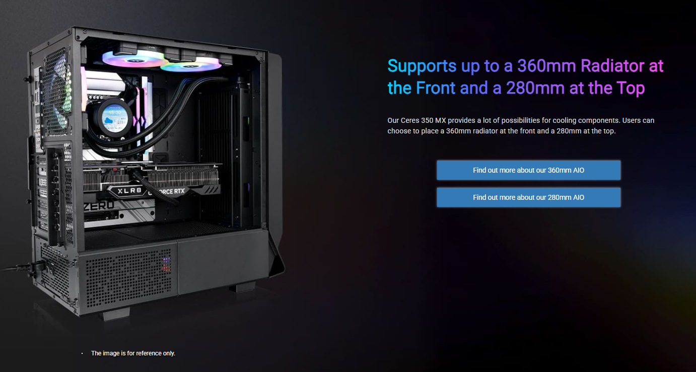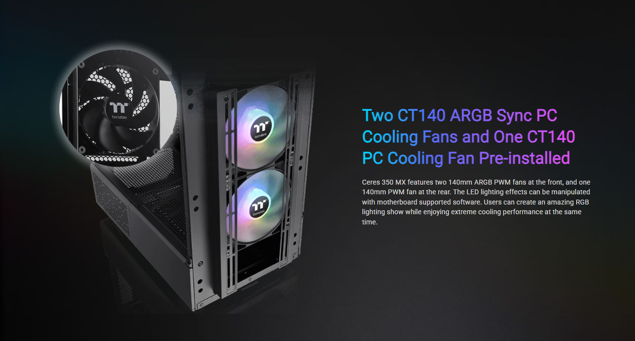 The Ceres 350 MX Mid Tower chassis has good expandability. It can support for both standard motherboards and hidden-connector motherboards, a CPU cooler with a maximum height of 185mm, GPU placement of up to 370mm in length (without radiator), and a power supply up to 220mm in length. Optimized for excellent cooling performance, the case comes with two CT140 ARGB Sync PC Cooling Fans pre-installed at the front and one CT140 PC Cooling Fan pre-installed at the rear; you can choose to install two 140mm fans at the front and on top, or three 120mm fans at the front and on top. For radiator compatibility, it can support up to 360mm at the front, giving more options for high-end expansions!