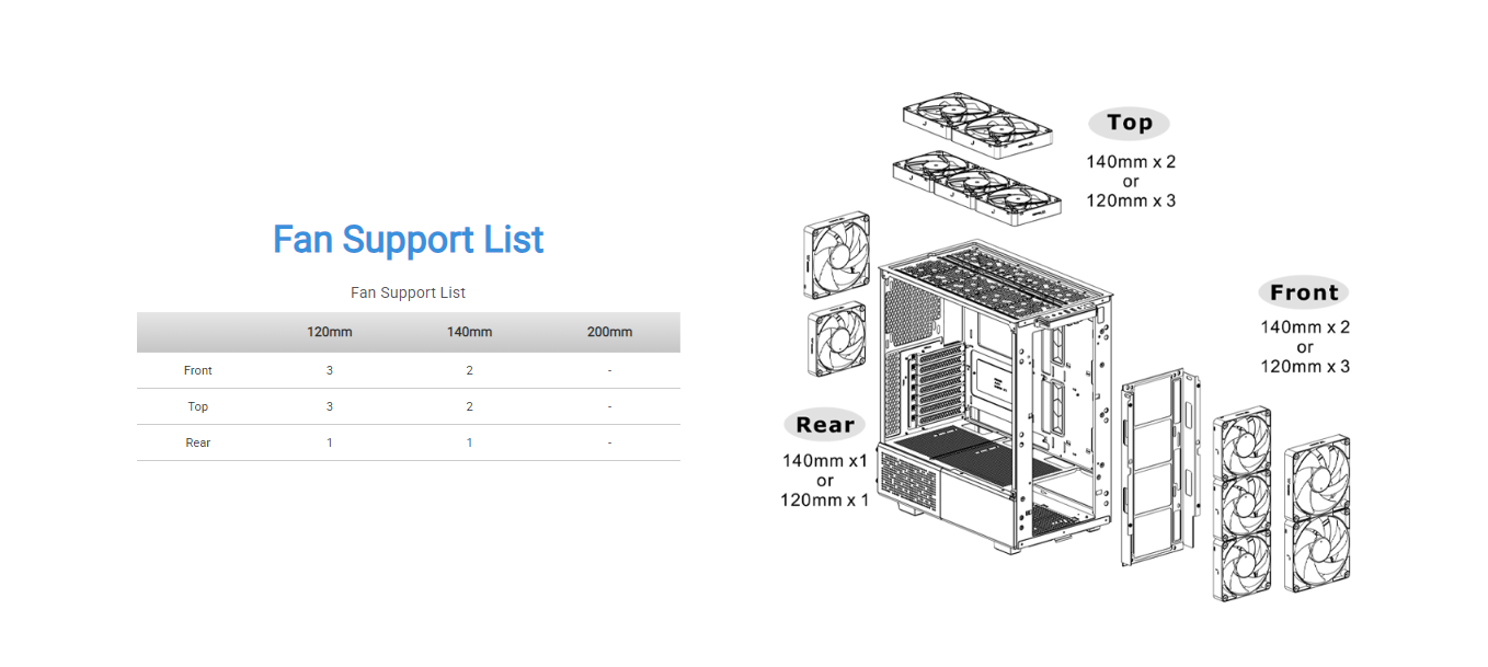 Top: 3 x 120mm, 2 x 120mm, 1 x 120mm 2 x 140mm, 1 x 140mmRear: 1 x 120mm, 1 x 140mm