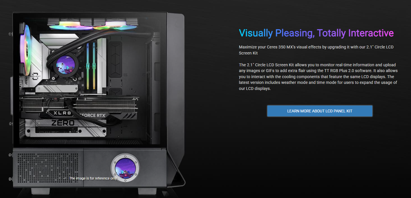 Ceres 350 MX Mid Tower Chassis is an ATX case that supports the latest Hidden-Connector motherboards (ASUS BTF series, MSI PROJECT ZERO series and GIGABYTE PROJECT STEALTH series) and comes with two interchangeable front panels. Featuring two CT140 ARGB Sync PC Cooling Fans at the front and one CT140 PC Cooling Fan at the rear, its RGB lighting can be controlled by motherboard software from ASUS, GIGABYTE, MSI, and ASRock. Up to five 140mm fans or seven 120mm fans can be installed in the chassis, and one 360mm radiator can be placed at the front of the chassis. What’s more, the Ceres 350 MX Mid Tower Chassis is compatible with a separately sold LCD panel kit with a 2.1″ circular LCD display to maximize the visual effects of the PC to its full potential.