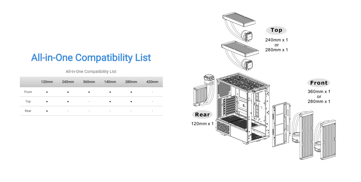 Top: 1 x 240mm, 1 x 120mm 1 x 280mm, 1 x 140mmRear: 1 x 120mm