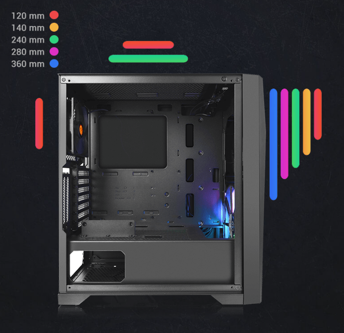 Commander G32 has good expandability. It can support a CPU cooler with a maximum height of 165mm, two-way VGA placement of up to 300mm in length for horizontal and 45mm in width for vertical option, a power supply with a length of up to 200mm (without HDD Rack) and RAM height limitation up to 40mm (with radiator series). Optimized for excellent cooling capability with one 200mm ARGB front fan and one 120mm rear fan preinstalled, the Commander G32 can house up to two 200mm at the front, two 140mm on the top, and one 140mm at the rear.