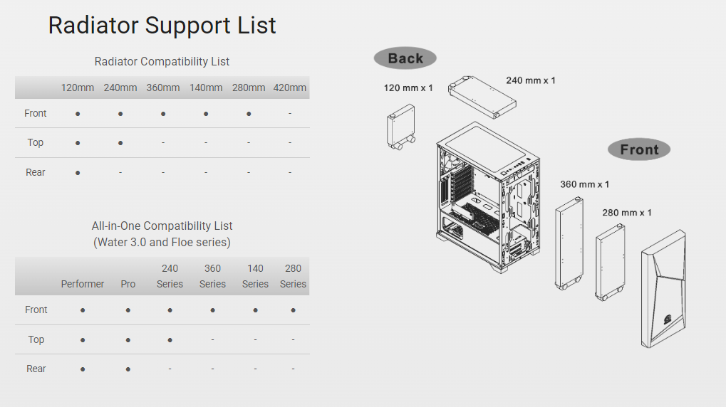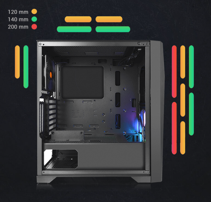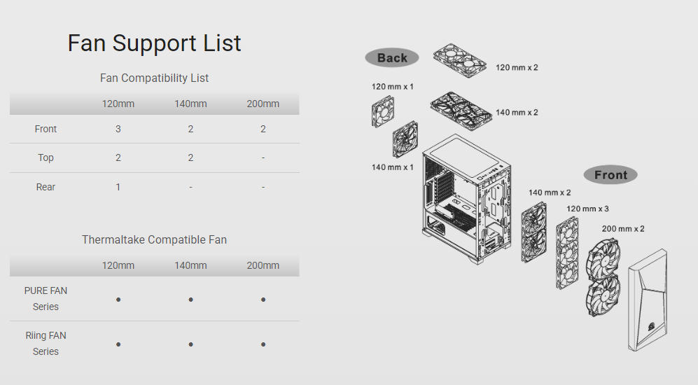 120mm x 3, 140mm x 2, 200mm x 2 Top: 120mm x 2, 140mm x 2 Rear: 120mm x 1, 140mm x 1