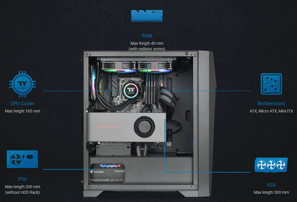 PSU length limitation: 160mm(With HDD Rack) 200mm(Without HDD Rack) VGA length limitation: 300mm VGA width limitation(Vertically): 45mm RAM height limitation: 40mm(With radiator series) |