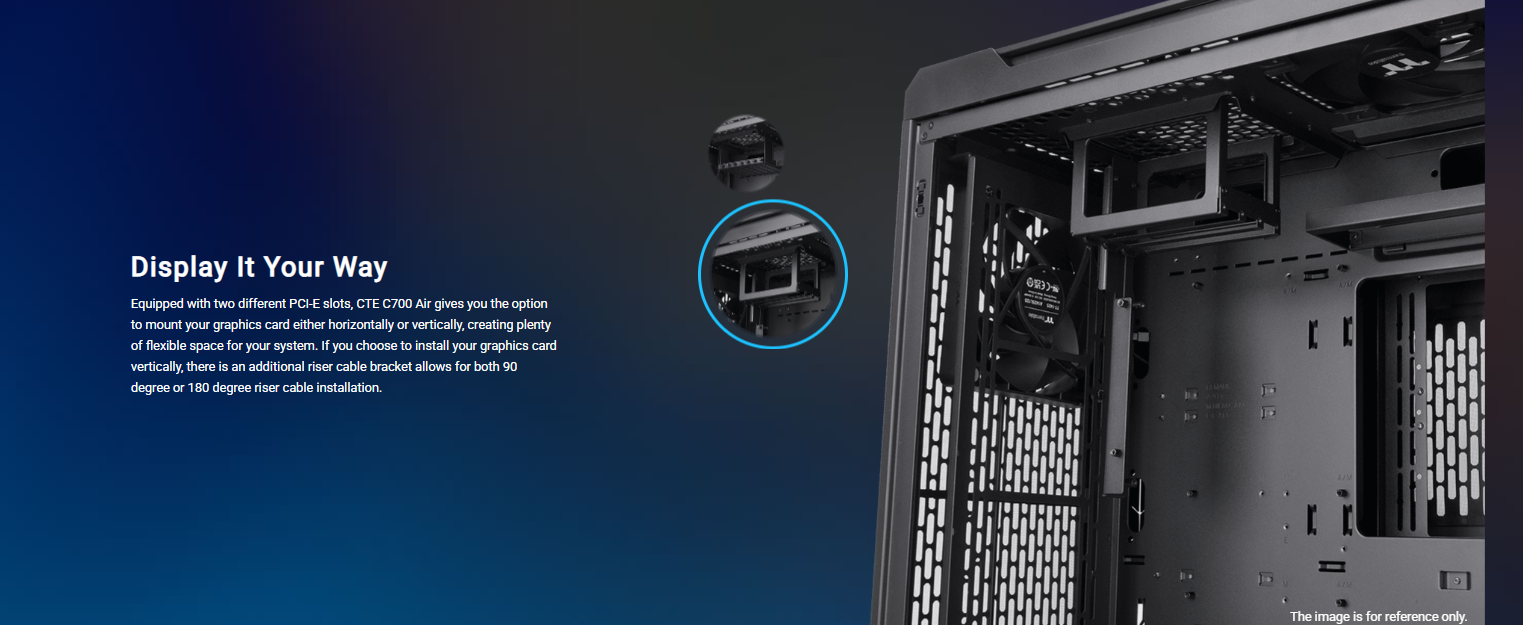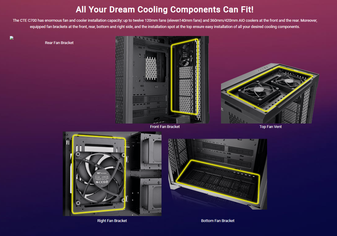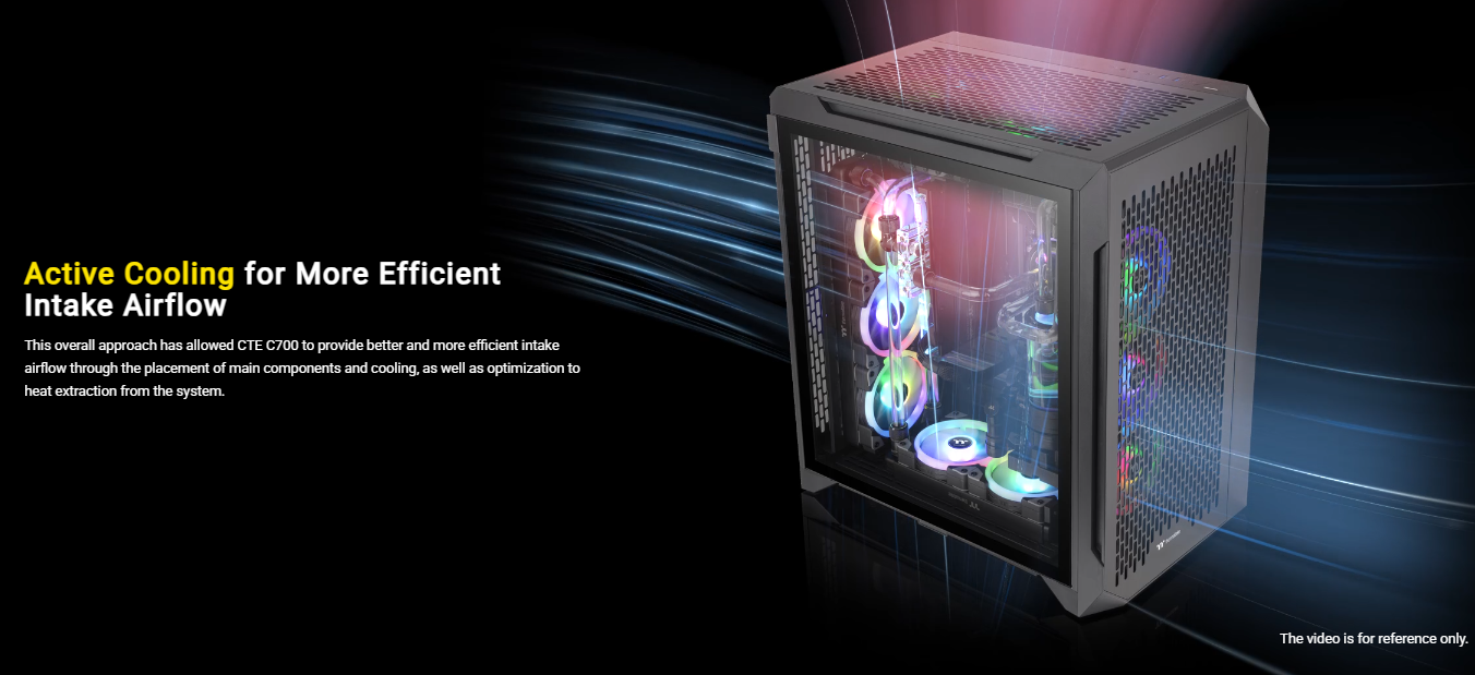 The CTE C700 Air, a specially designed E-ATX mid tower chassis from the new CTE form factor series, was engineered to provide optimal thermal efficiency and maximum airflow to ensure that critical components of your build are provided with adequate cooling. To achieve this the CTE C700 Air can support up to a 420mm AIO radiator not only at the front but also at the rear of the case. It comes with three 140mm CT140 fans pre-installed and it can support up to a 420mm AIO radiator at the front and at the rear of the chassis. Its dual-chamber design allows users to showcase key components and provides ample space for superior cooling solutions, with the ability to accommodate up to twelve 120mm fans (eleven 140mm fans) inside the case thanks to the front, bottom, rear and right fan brackets, as well as the top fan vent. It also features many nice details such as two different PCI-E slots, removable filters, a pump and reservoir bracket and Velcro straps for easy cable management. Whether you are a PC enthusiast or looking for a custom liquid cooling case, get ready to be amazed by the CTE C700 Air!