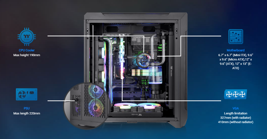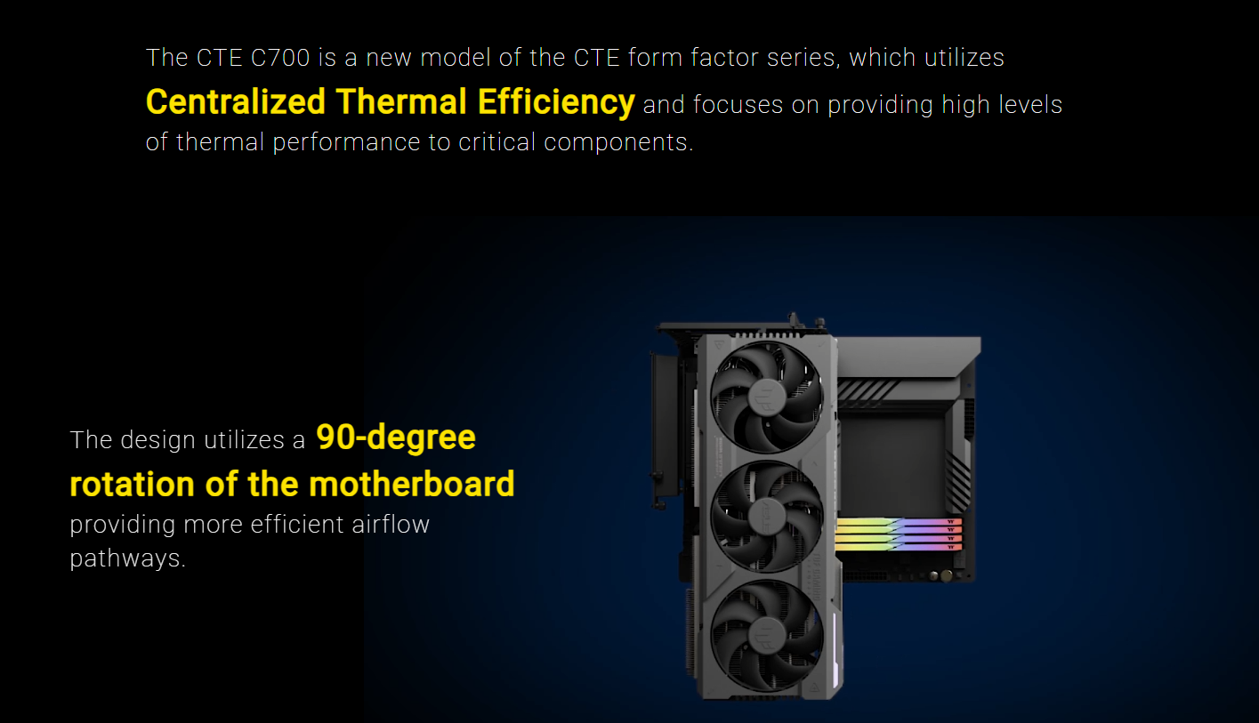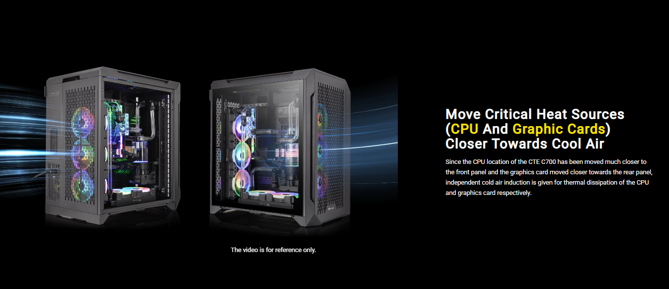 The CTE Form Factor Designed by Thermaltake, stands for Centralized Thermal Efficiency, and is focused around providing high level thermal performance to critical components. The design utilizes a 90-degree rotation of the motherboard providing more efficient airflow pathways. Since the CPU location has been moved much closer to the front panel and the graphics card moved closer towards the rear panel, independent cold air induction is given for thermal dissipation of the CPU and graphics card respectively. This overall approach has allowed CTE to provide better and more efficient intake airflow through the placement of main components and cooling, as well as optimization to heat extraction from the system.
