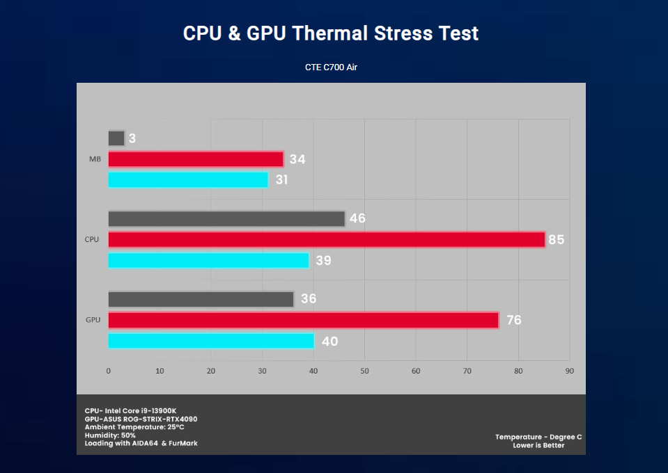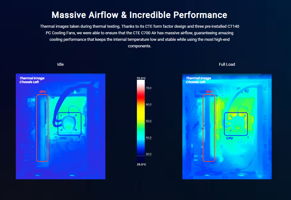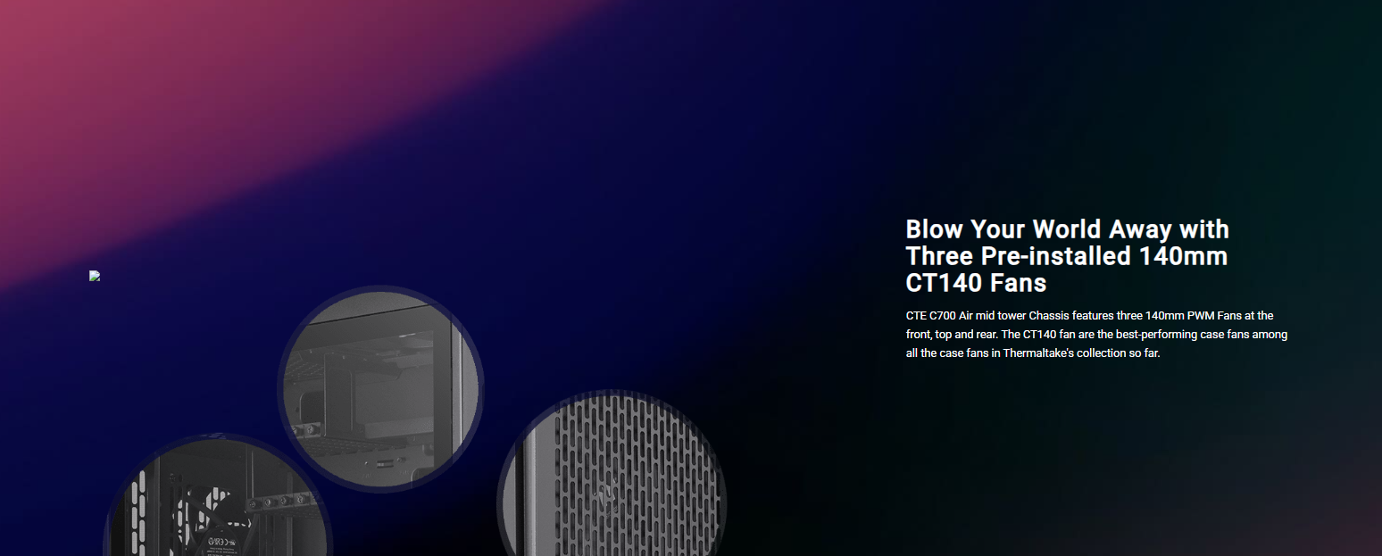 The CTE C700 Air, a specially designed E-ATX mid tower chassis from the new CTE form factor series, was engineered to provide optimal thermal efficiency and maximum airflow to ensure that critical components of your build are provided with adequate cooling. To achieve this the CTE C700 Air can support up to a 420mm AIO radiator not only at the front but also at the rear of the chassis. Three 140mm CT140 fans are pre-installed.
