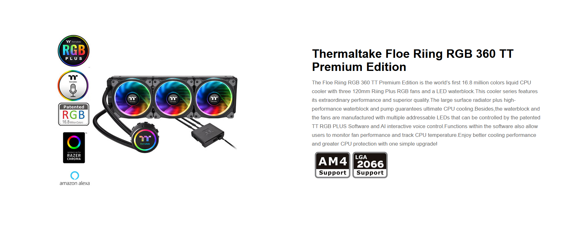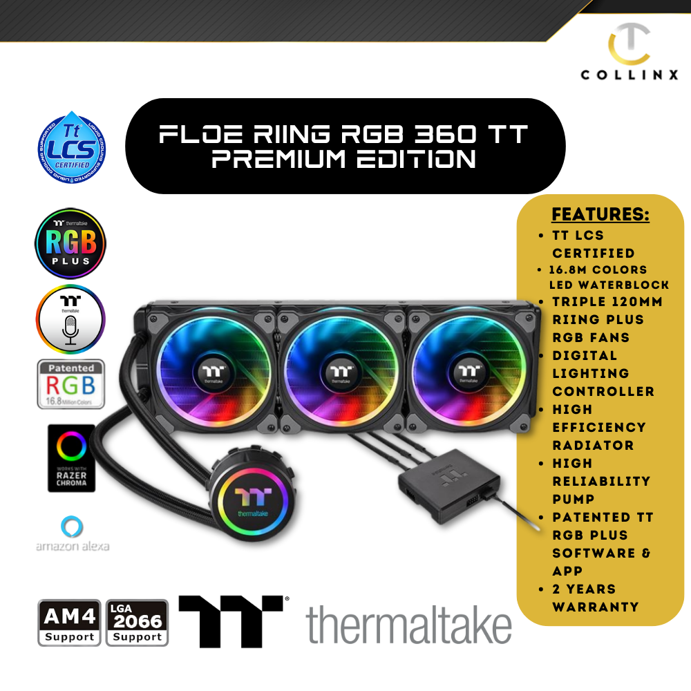 The Floe Riing RGB 360 TT Premium Edition is the world’s first 16.8 million colors liquid CPU cooler with three 120mm Riing Plus RGB fans and a LED waterblock.This cooler series features its extraordinary performance and superior quality.The large surface radiator plus high-performance waterblock and pump guarantees ultimate CPU cooling.Besides,the waterblock and the fans are manufactured with multiple addressable LEDs that can be controlled by the patented TT RGB PLUS Software and AI interactive voice control.Functions within the software also allow users to monitor fan performance and track CPU temperature.Enjoy better cooling performance and greater CPU protection with one simple upgrade!