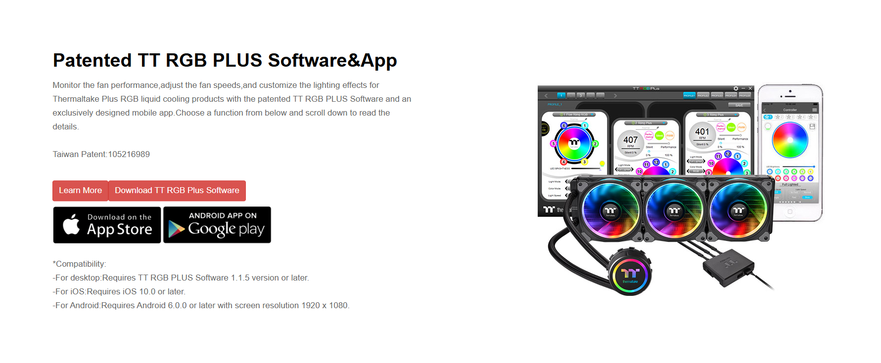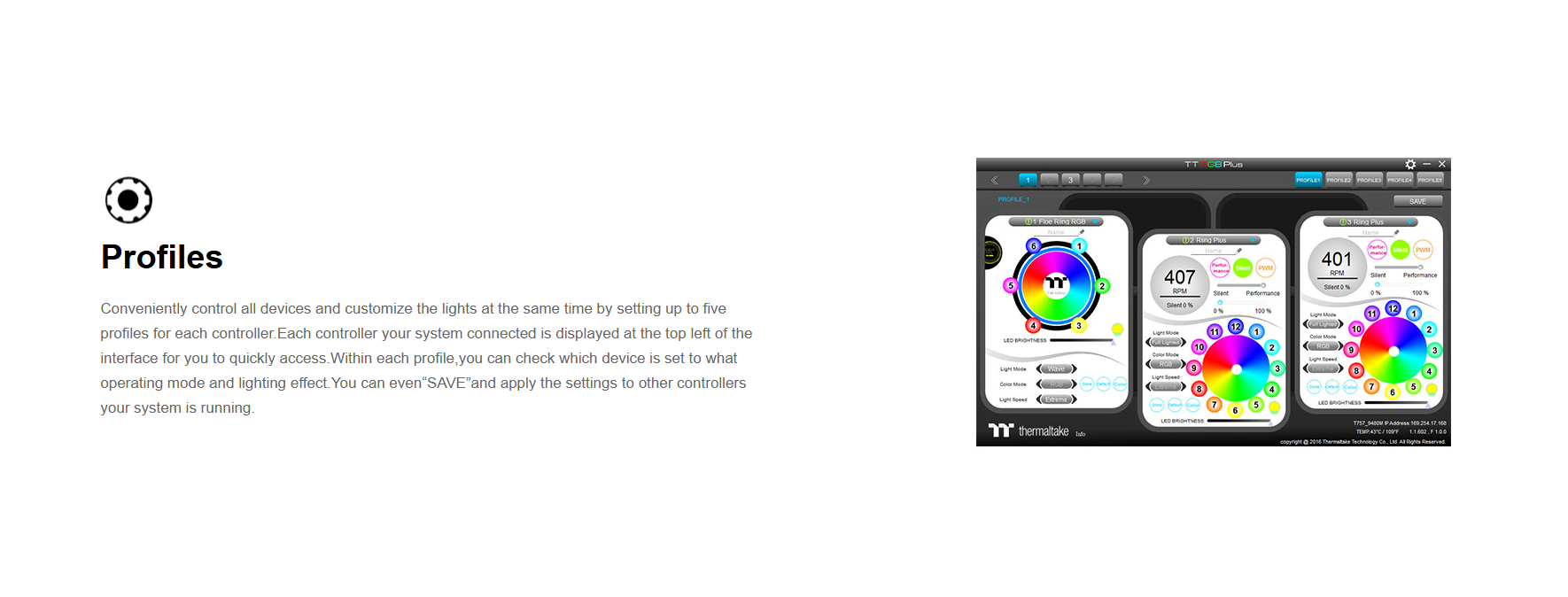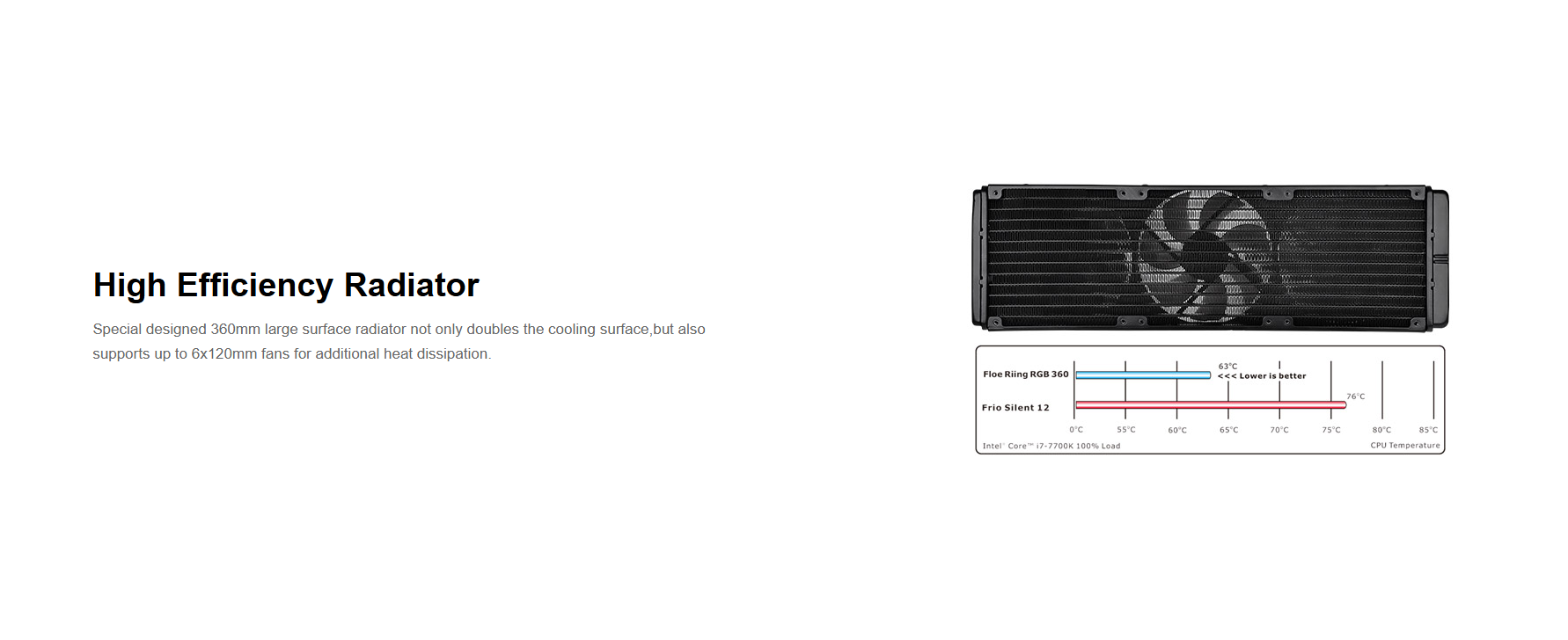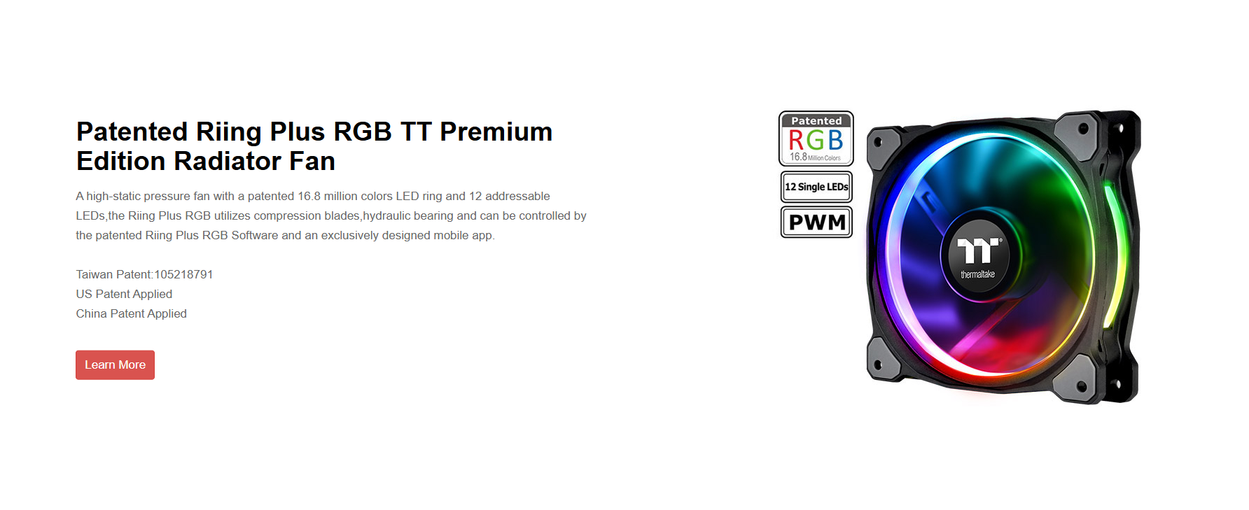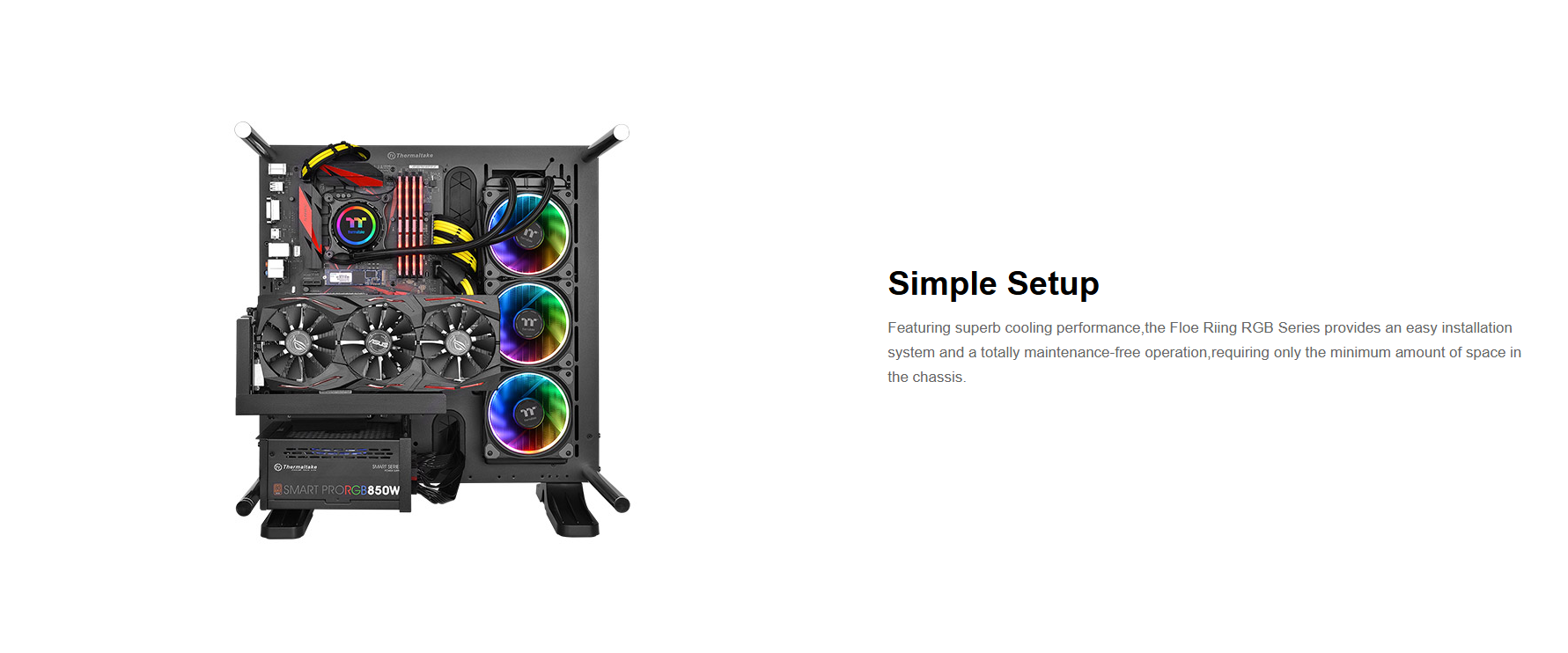Software controlled 360mm liquid cooler with 16.8M colors LED waterblock, patented Riing Plus RGB fans and PWM function.