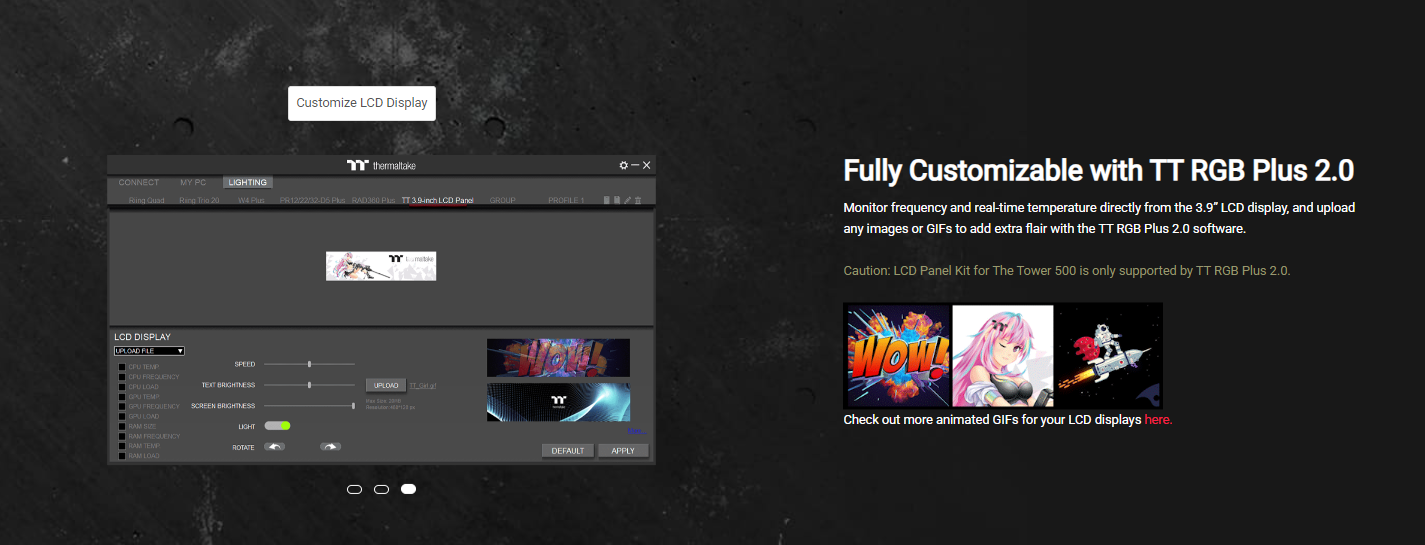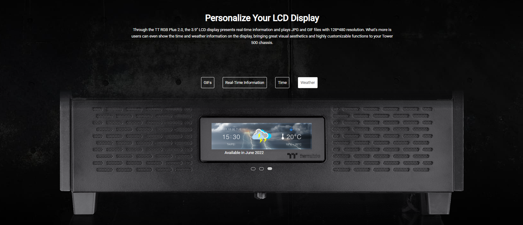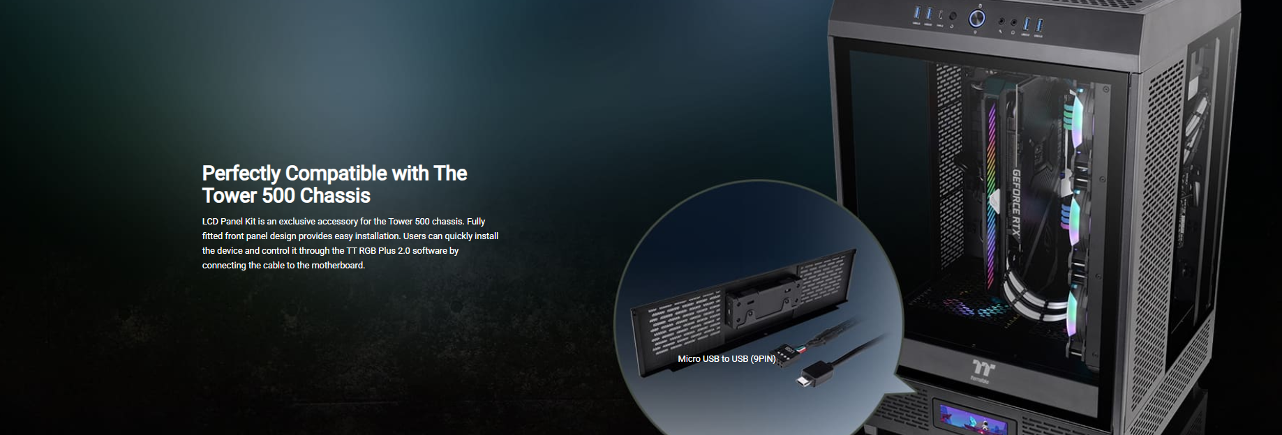 LCD Panel Kit is an exclusive expansion accessory for the Tower 500 chassis. With its 3.9” LCD display, users can use the TT RGB Plus 2.0 software to gain full control of performance monitoring and personalized effects. Additionally, the LCD Panel Kit can be paired with other Thermaltake Ultra series products, providing the best LCD visual experience.