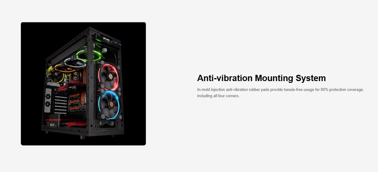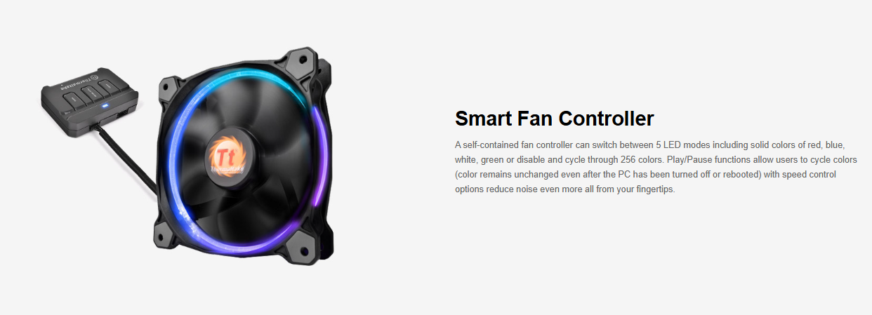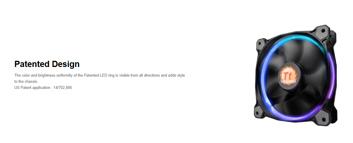 Thermaltake has released the new Riing 14 LED Series, a 140mm fan fitted to enhance static pressure that produces impressive cooling performance with an optimized fan blade. Hydraulic bearings for silent operation guarantee ultra-low noise. In addition, an anti-vibration mounting system strengthens the stability during operation. The patented LED Ring maintains color and brightness uniformity; the lighting effect is visible from all sides and angles. The four-colored LED ring (in blue, red, white, and green) adds style to the chassis.