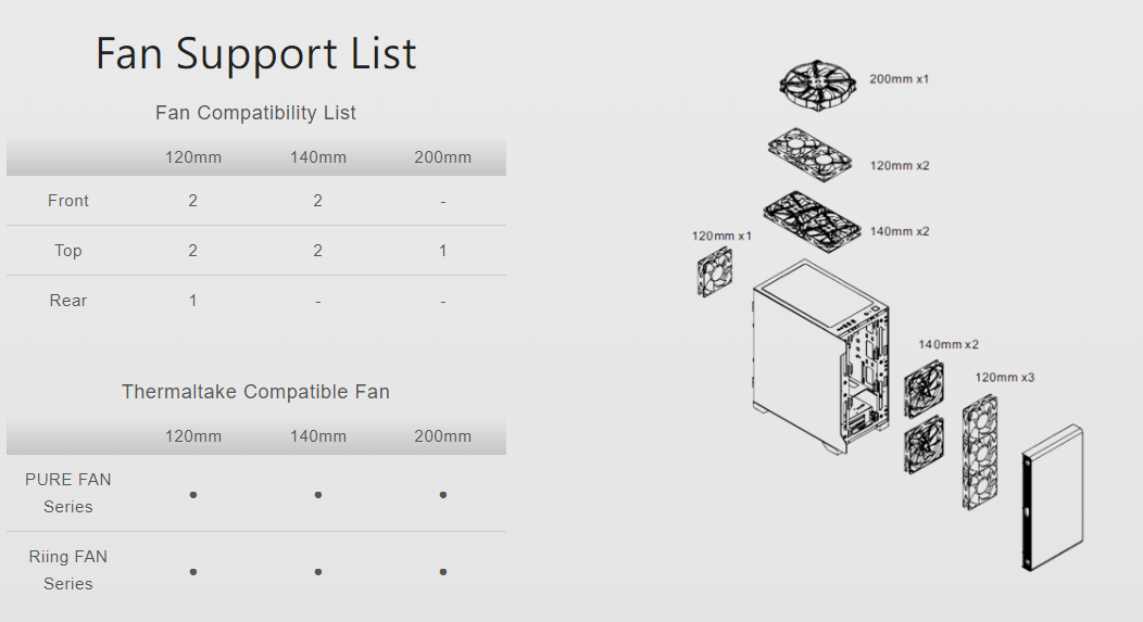 2 x 120mm, 2 x 140mm Top: 2 x 120mm, 2 x 140mm, 1 x 200mm Rear: 1 x 120mm, |