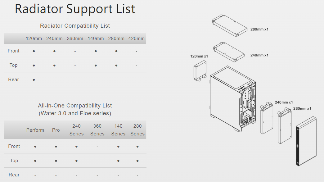1x 240mm, 1 x 280mm Top: 1 x 240mm, 1x 280mm Rear: 1 x 120mm, |
