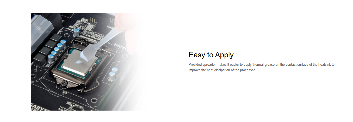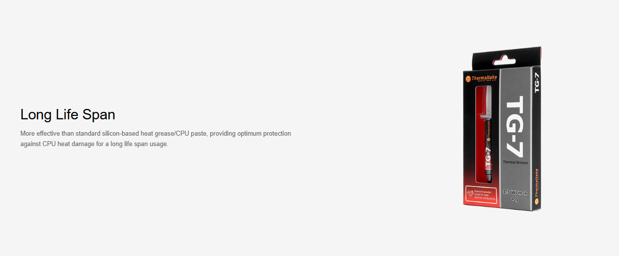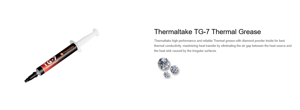 Thermaltake high performance and reliable Thermal grease with diamond powder inside for best thermal conductivity, maximizing heat transfer by eliminating the air gap between the heat source and the heat sink caused by the irregular surfaces.