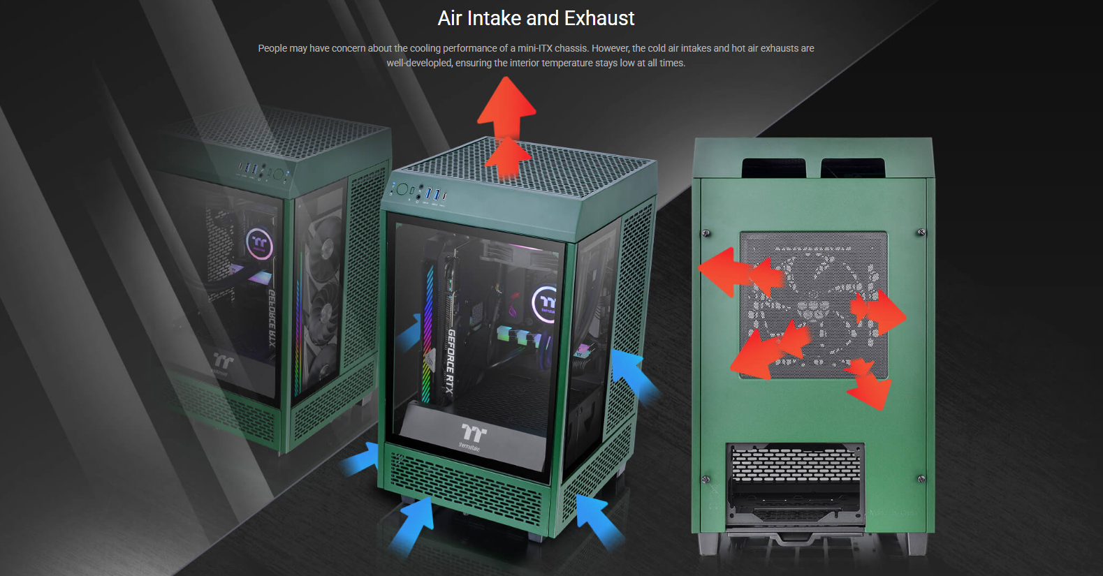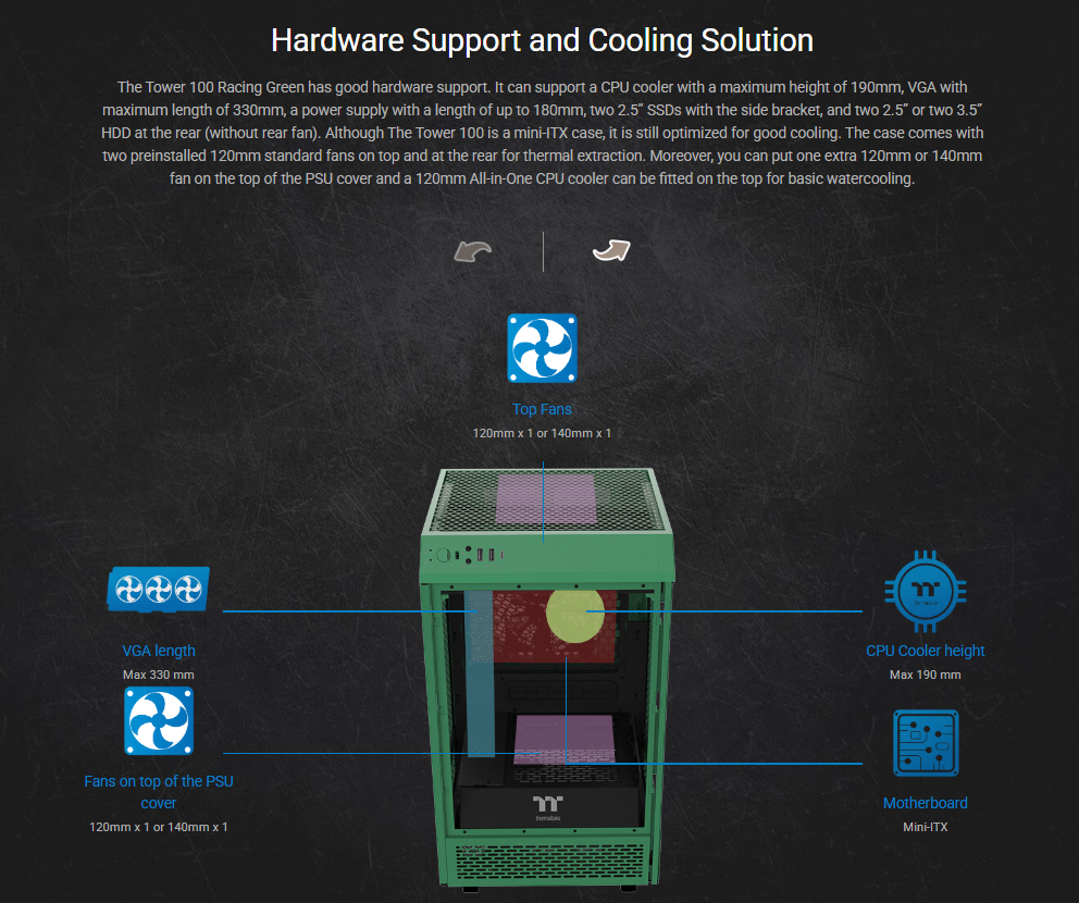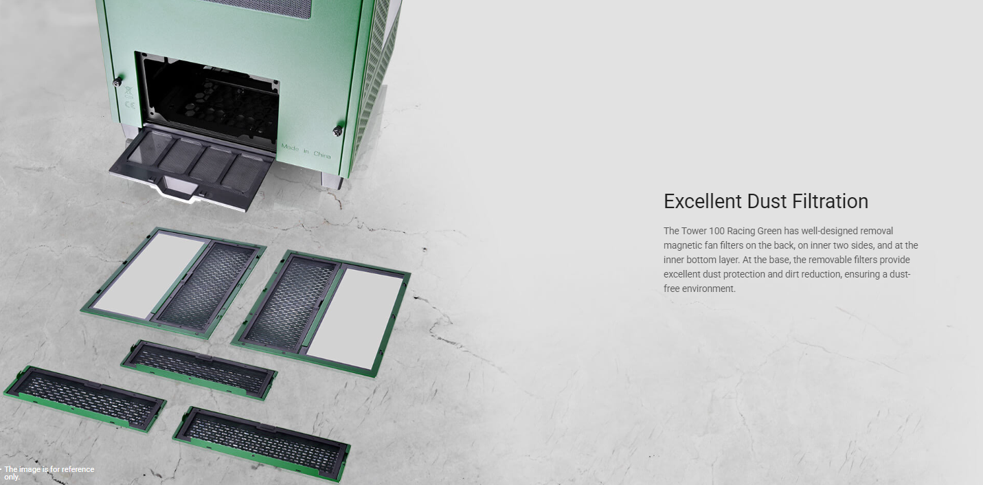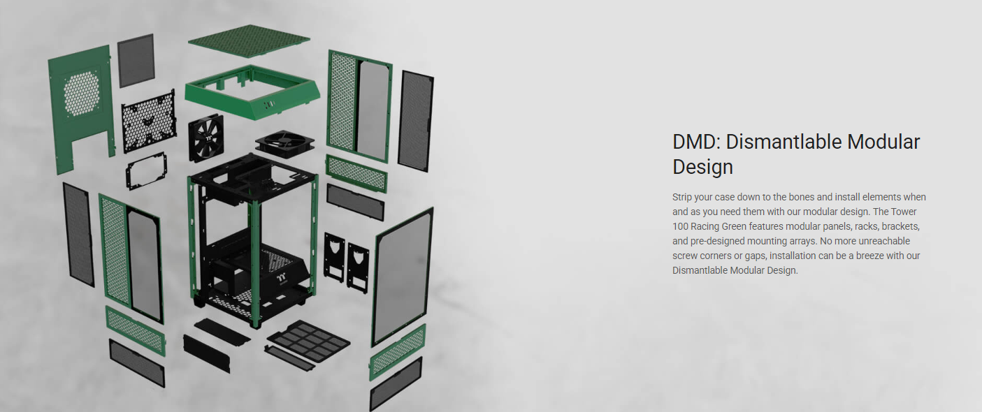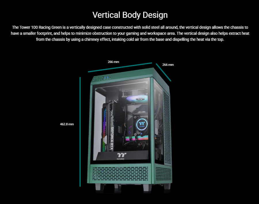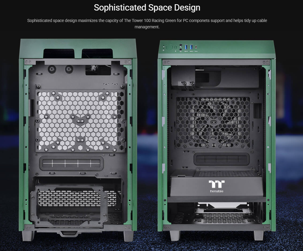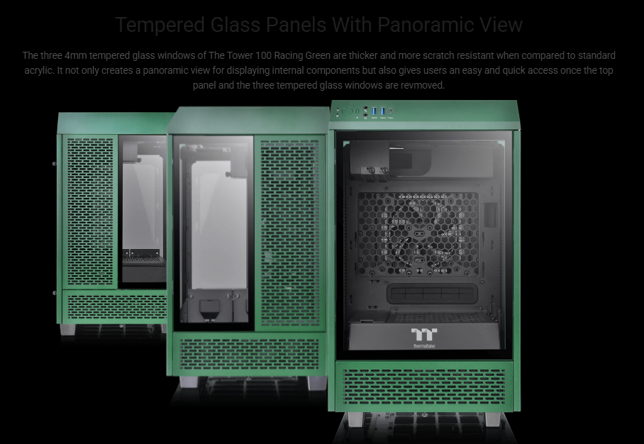 Designed to expand the legacy of The Tower 900 E-ATX Super Tower Chassis, The Tower 100 Racing Green Mini Chassis is the newest member of The Tower Series. It features three 4mm tempered glass windows for a stunning view and two preinstalled 120mm standard fans on top and at the rear for exhaust. It is a much smaller version of The Tower 900 with dimensions of 462.8mm (Height), 266mm (Width), 266mm (Depth). Though it may not be the smallest Mini-ITX chassis on the market, it is a highly capable one that can fit high-end components like the RTX 30 Series Graphics Cards. The Tower 100 Racing Green Mini Chassis is designed to target users who have a limited space at their workplace or at home, or those who simply do not want their PC to take too much space. No matter if you are a regular users, gamers, or content creators, etc. you will find it ideal and can place it almost anywhere in your room.