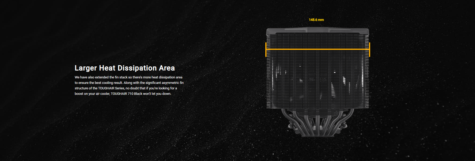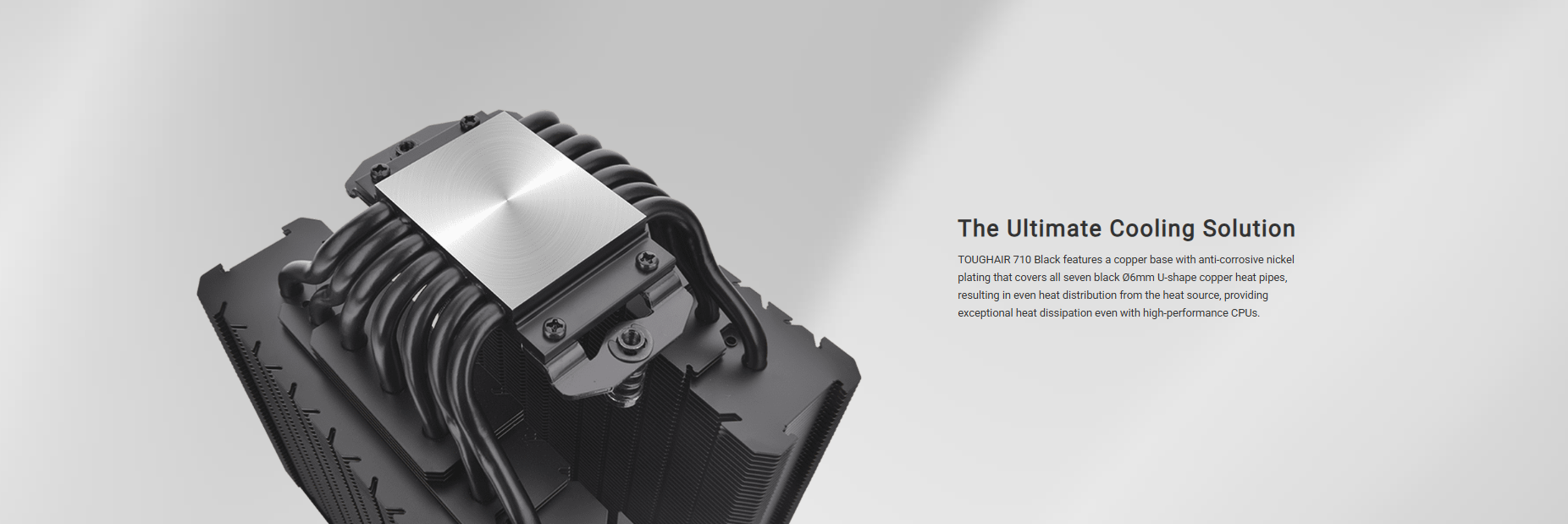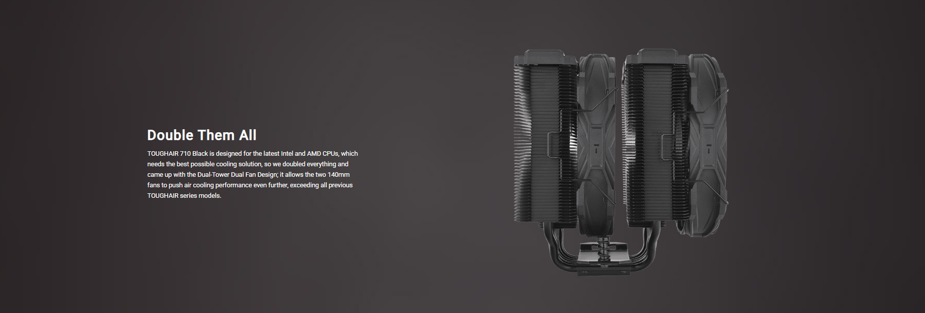 TOUGHAIR 710 Black is constructed with a Dual-Tower Dual Fan Design for the latest Intel and AMD CPUs, allowing the two 140mm fans to perform the best possible cooling and kicking the TOUGHAIR series up a notch for the latest CPUs.