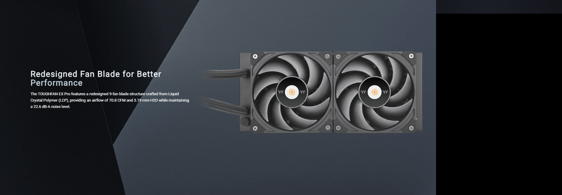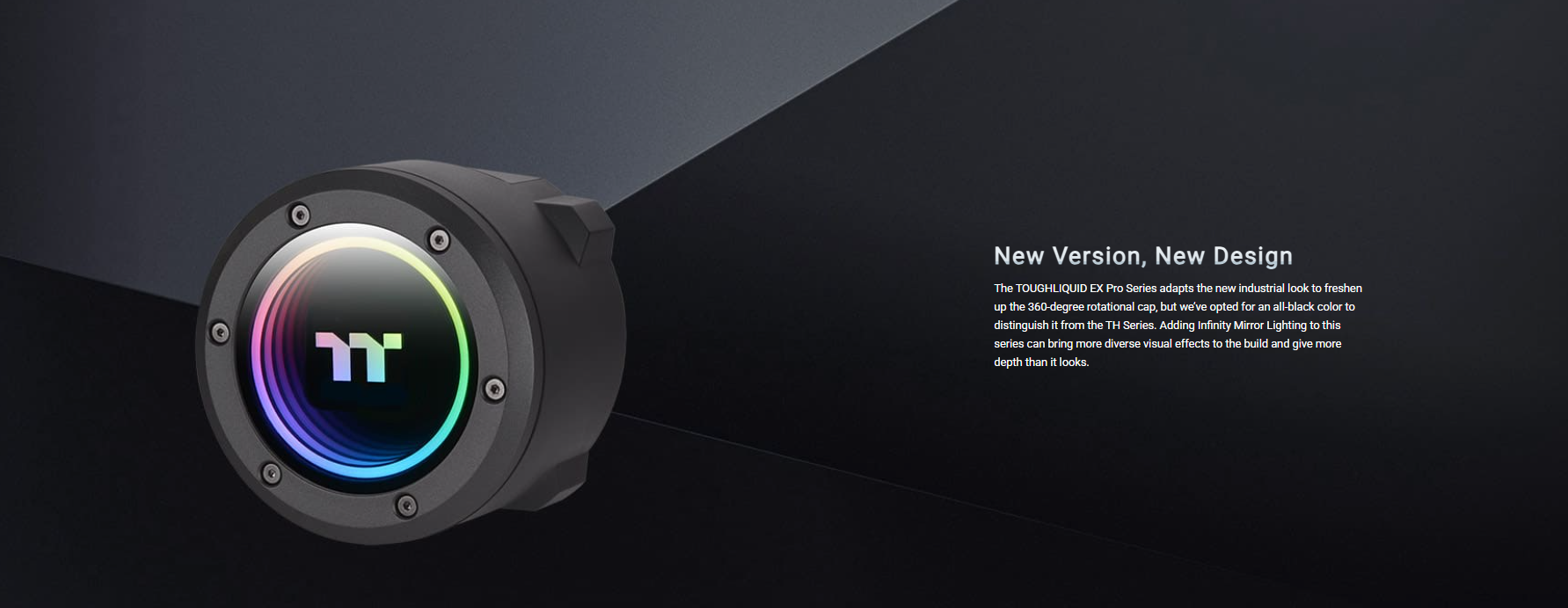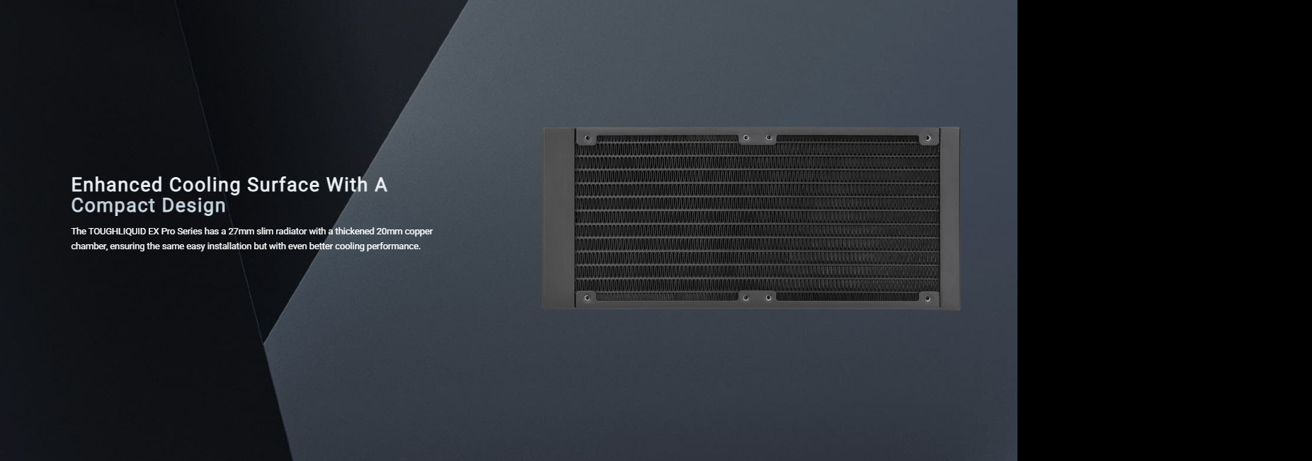 TOUGHLIQUID 240 EX Pro introduces a new all-black industrial cap with an infinity mirror light design, adding a fresh look to the TOUGHLIQUID series. The AIO is equipped with two high-performance TOUGHFAN EX12 Pro fans, the TOUGHLIQUID 240 EX Pro provides a better PC building experience with the new MagForce 2.0, allowing you to snap the fans together more quickly and ensures a steadier connection!