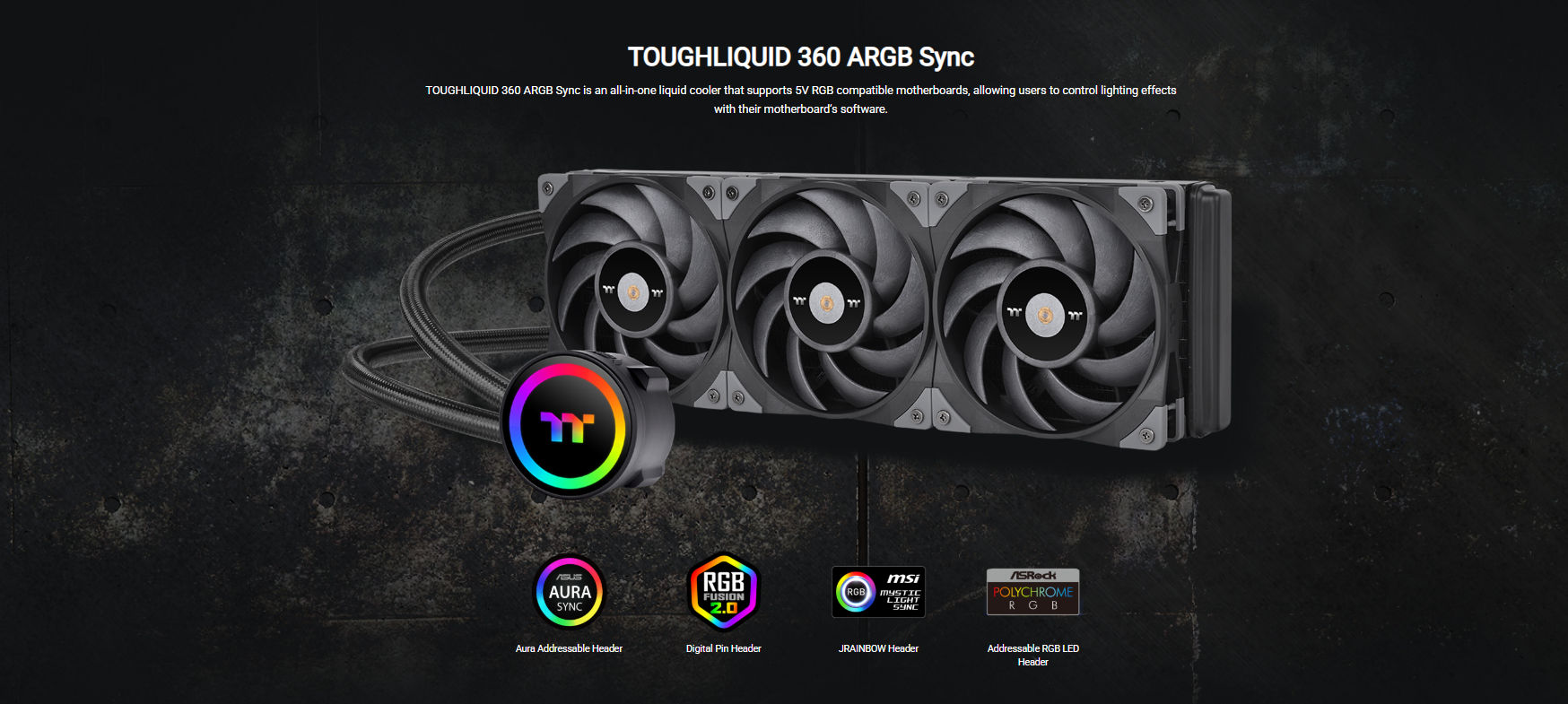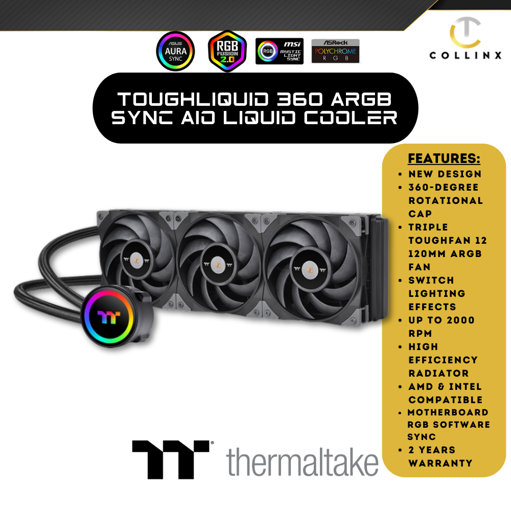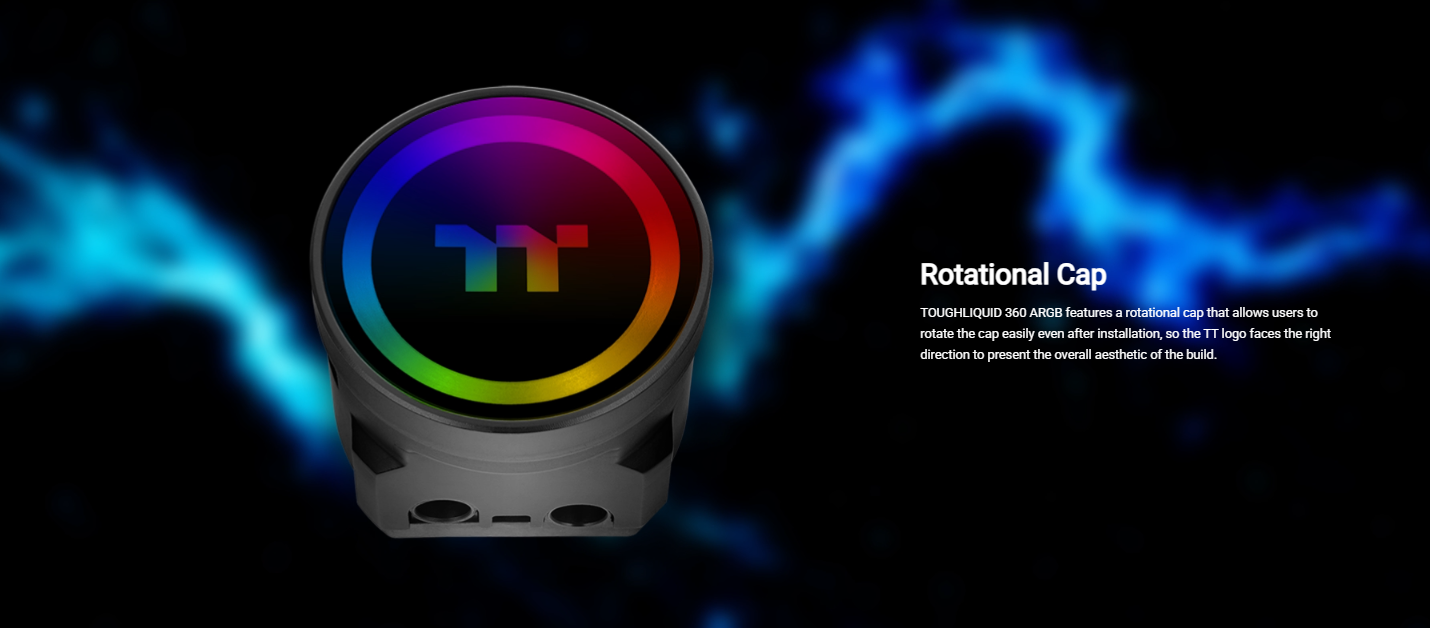 TOUGHLIQUID 360 ARGB Sync AIO Cooler is a TOUGHFAN 12 equipped all-in-one liquid cooler with a rotational cap that has 6 LEDs, which can be controlled by both built-in controller and 5V RGB compatible motherboards.