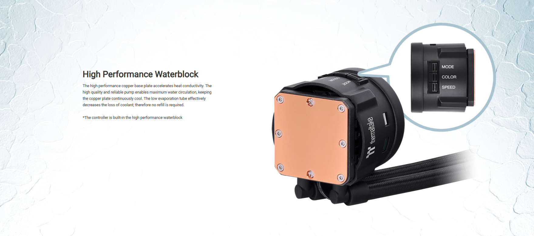 The mirror-finished water block is designed with a built-in controller, which grants easy control of the water block’s lighting mode, speed, and color, creating effortless cable management while enjoying the lighting effects with direct access.
