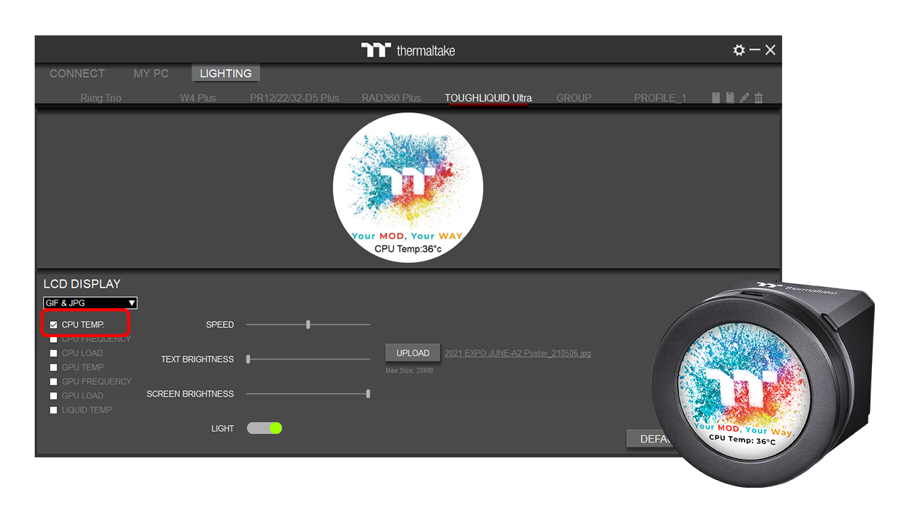 Monitor frequency and real-time temperature directly from our 2.1 inch LCD Display, and upload any image or GIF file to add extra flair with the TT RGB Plus 2.0 software. Caution: The TOUGHLIQUID Ultra Series is only supported by the TT RGB Plus 2.0.