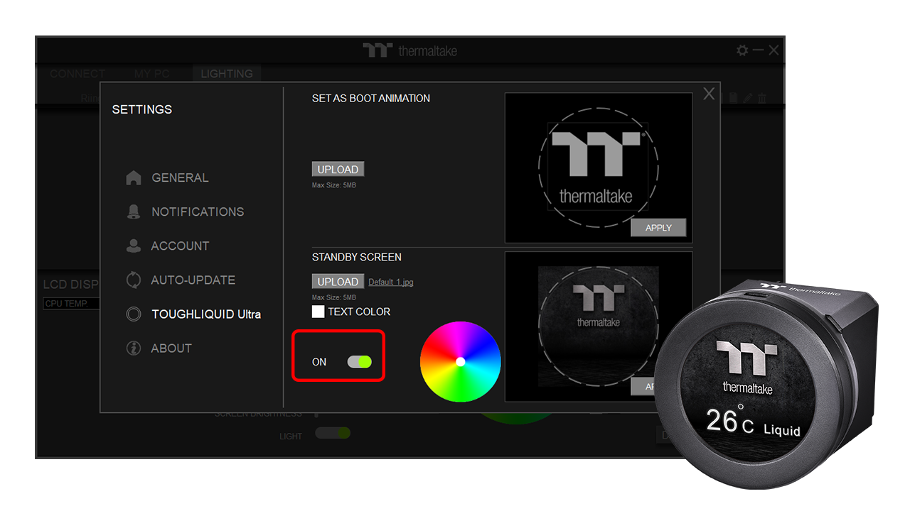 TOUGHLIQUID Ultra 240 AIO Cooler is an all-in-one liquid cooler with our latest LCD display that presents real-time information of the system and even plays GIF files with 480*480 resolution. It’s also equipped with TOUGHFAN 12 Turbo fans to provide outstanding cooling results while maintaining minimal audible noise.
