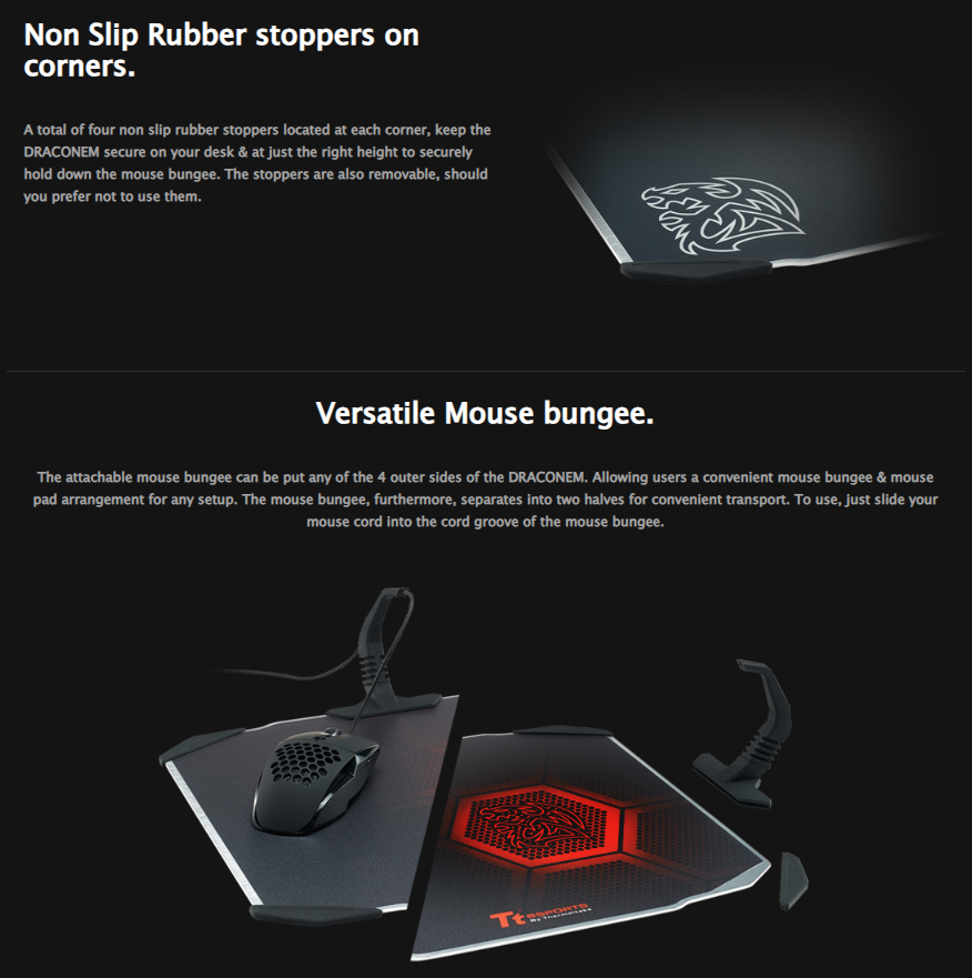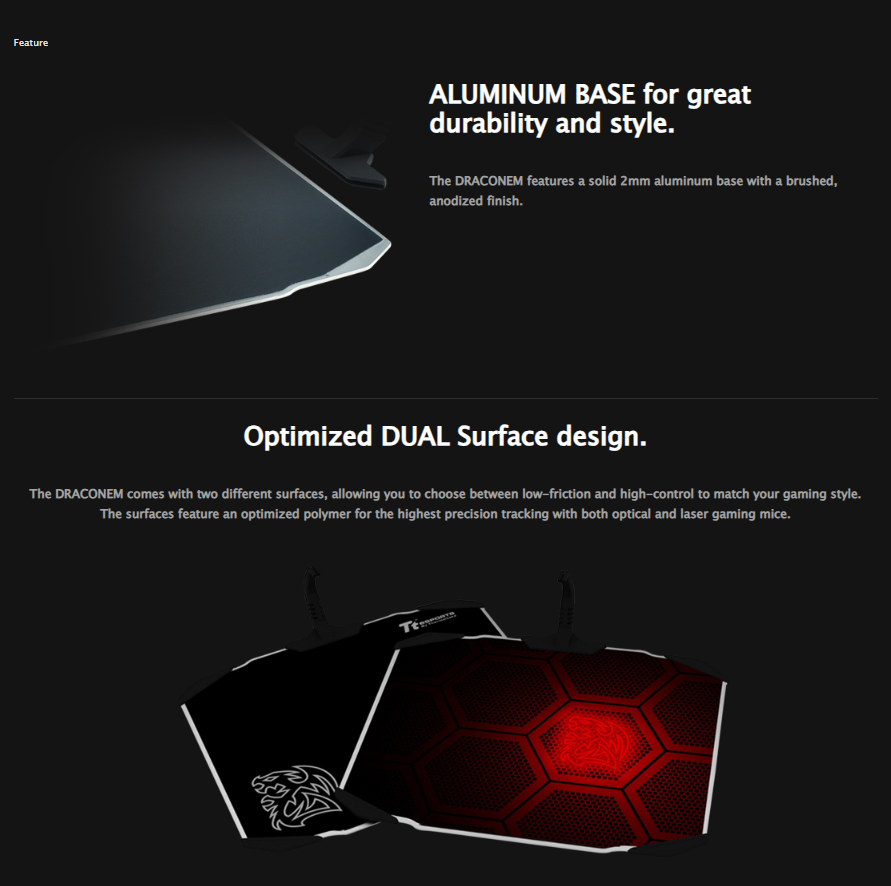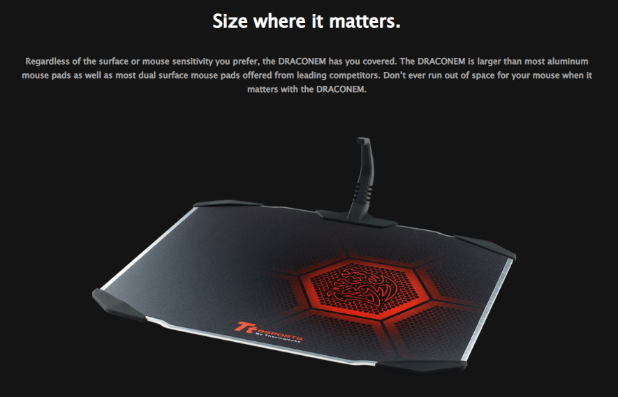 The DRACONEM aluminum mouse pad is built to be tough enough for the hardest of battles! Tt eSPORTS decided to offer gamers the most in a premium mouse pad with the DRACONEM. The DRACONEM offers two different surfaces, an aluminum base, and a unique mouse bungee. In addition, its one of the largest aluminum mouse pads on the market because there’s no reason for cloth pads to be the only ones that come in bigger sizes.