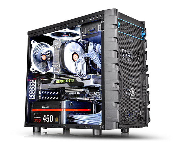 Designed for gamers, perforated top panel build for easy heat dissipation and rapid air intake for maximum ventilation. The heighten foot-stands at the bottom help to enhance airflow. Featuring a transparent side window to offer a direct view of inner system.