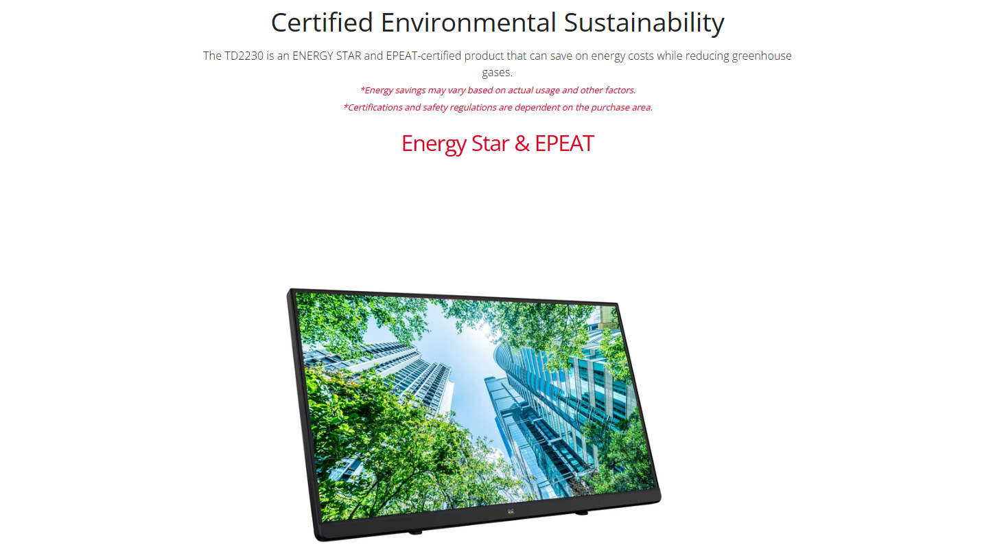 Regulations: cTUVus, FCC-B, ICES003, Energy Star, EPEAT, CEC, MX-CoC, Mexico Energy, CE, CE EMC, CB, RoHS, ErP, REACH, WEEE, EAC, UkrSEPRO, BIS, CCC, China RoHS, China Energy Label, CECP PACKAGE CONTENTS: TD2230 x1, 3-pin Mickey Mouse Plug (IEC C5) x1, HDMI Cable (v1.4; Male-Male) x1, USB A/B Cable (v3.2; Male-Male) x1, Audio Cable (Male-Male) x1, AC/DC Adapter x1, Quick Start Guide x1 Recycle/Disposal: Please dispose of in accordance with local, state or federal laws. Warranty: *Warranty offered may differ from market to market Power Management: Energy Star standards, EPEAT