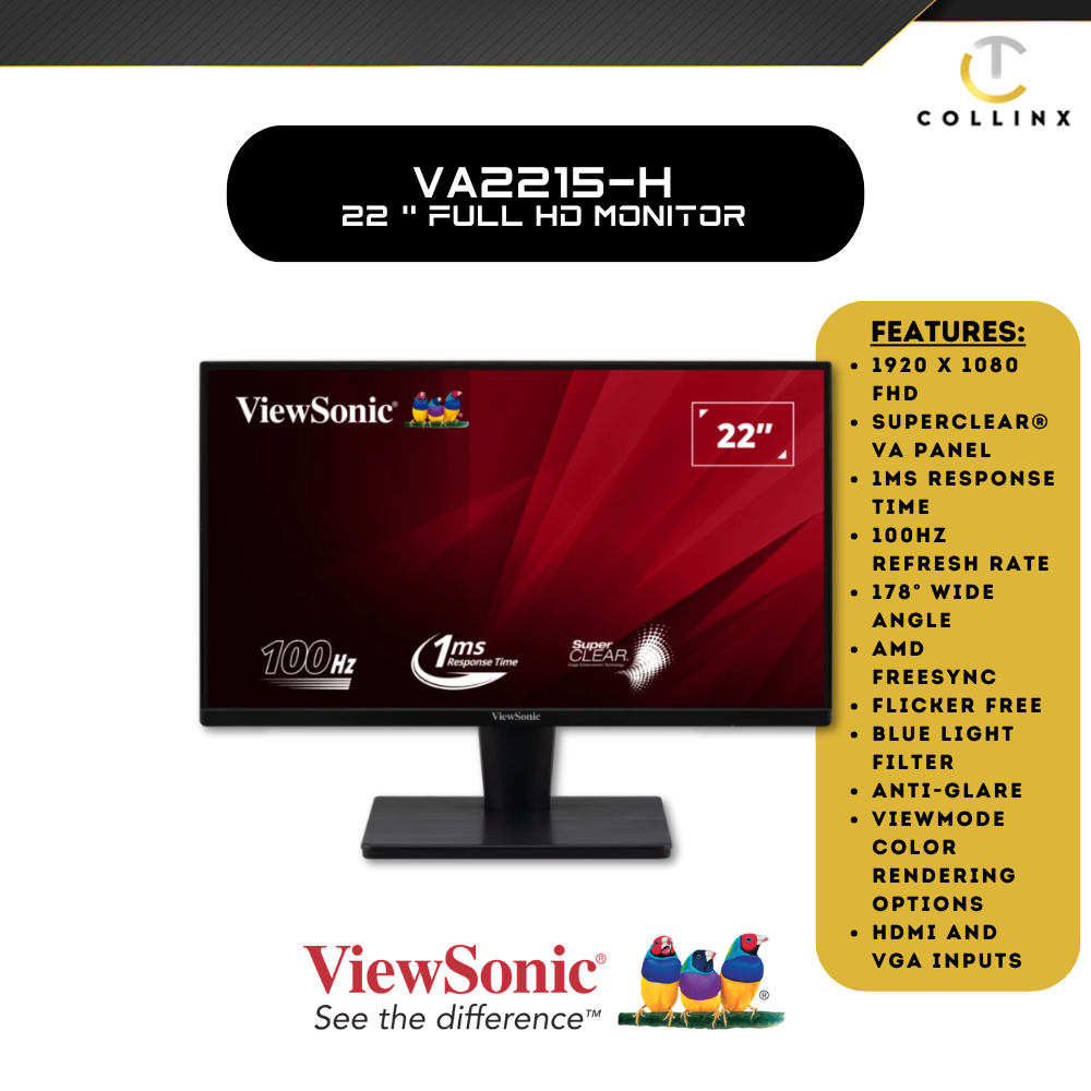 The ViewSonic VA2215-H is a 22” Full HD monitor with HDMI and VGA input for business or home usage. Delivering a stunning image quality with low power consumption, this monitor provides six ViewMode presets that deliver optimized screen performance based on your needs. FreeSync means no tearing or stuttering even when gaming. The eye care technology that comes standard with all VA monitors helps to eliminate eyestrain from extended viewing periods. A VESA-compatible mount makes this monitor is easy to setup on the wall or with a wide range of industry-standard mounts.