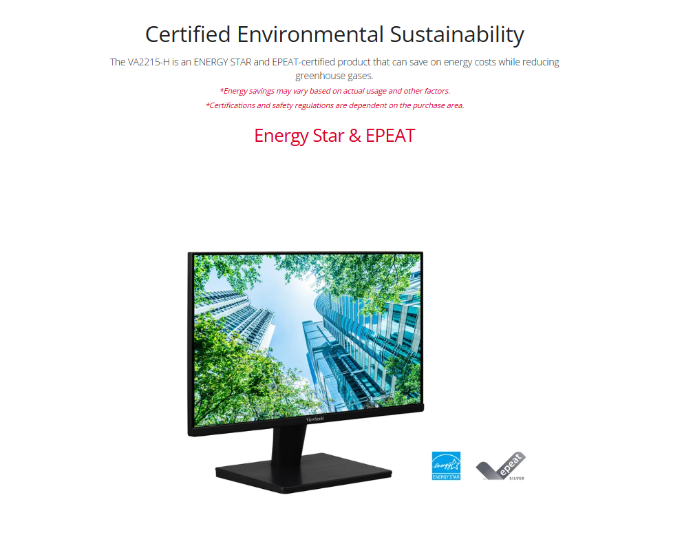 Regulations: cTUVus, FCC-B, ICES003, Energy Star, EPEAT, CEC, IQC-ST, CE, CE EMC, CB, RoHS, ErP, REACH, WEEE, EAC, UkrSEPRO, BSMI, TGM, BIS PACKAGE CONTENTS: VA2215-H x1, HDMI Cable (v1.4; Male-Male) x1, AC/DC Adapter x1, Quick Start Guide x1 Recycle/Disposal: Please dispose of in accordance with local, state or federal laws. Warranty: *Warranty offered may differ from market to market Power Management: Energy Star standards, EPEAT
