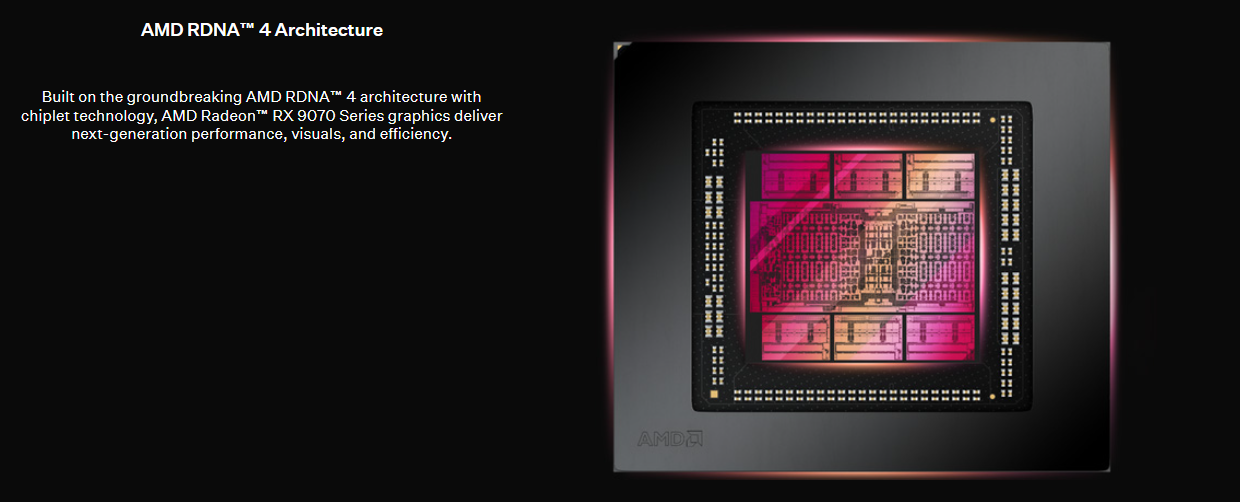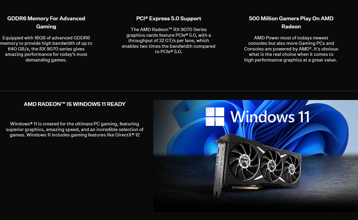 64 AMD RDNA™ 4 Compute Units(with RT+AI Accelerators) AMD Infinity Cache™ technology DisplayPort™ 2.1 AMD Radiance Display™ Engine AMD Radeon™ Boost technology* AMD Radeon™ Anti-Lag* technology* 16GB GDDR6 on 256-Bit Memory Bus PCI® Express 5.0 ready AMD FidelityFX™ technologies* AMD FidelityFX™ Super Resolution technology* Microsoft® DirectX® 12 Ultimate Microsoft® DirectStorage Vulkan® Optimized AMD smart technologies* AMD Software: Adrenalin Edition™ application AMD Noise Suppression* AMD Privacy View* AMD Radeon™ Super Resolution technology* AMD Link* AMD Freesync™ technology*