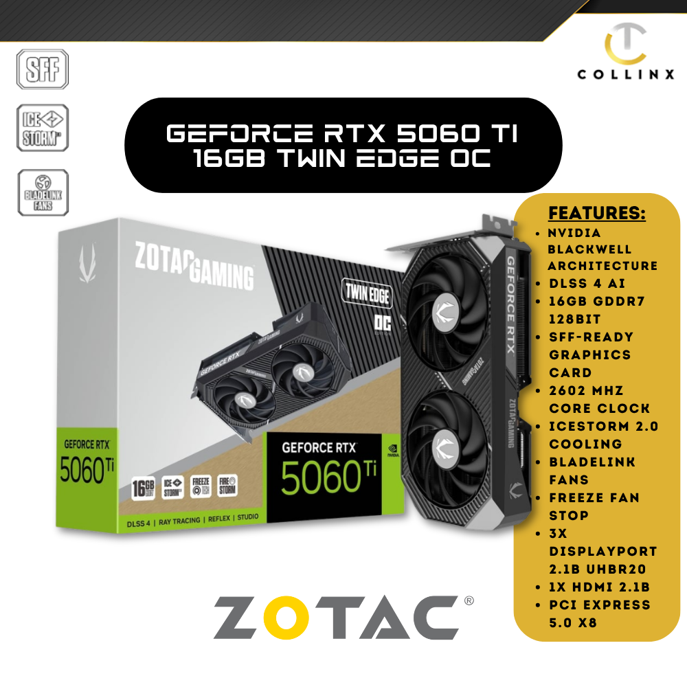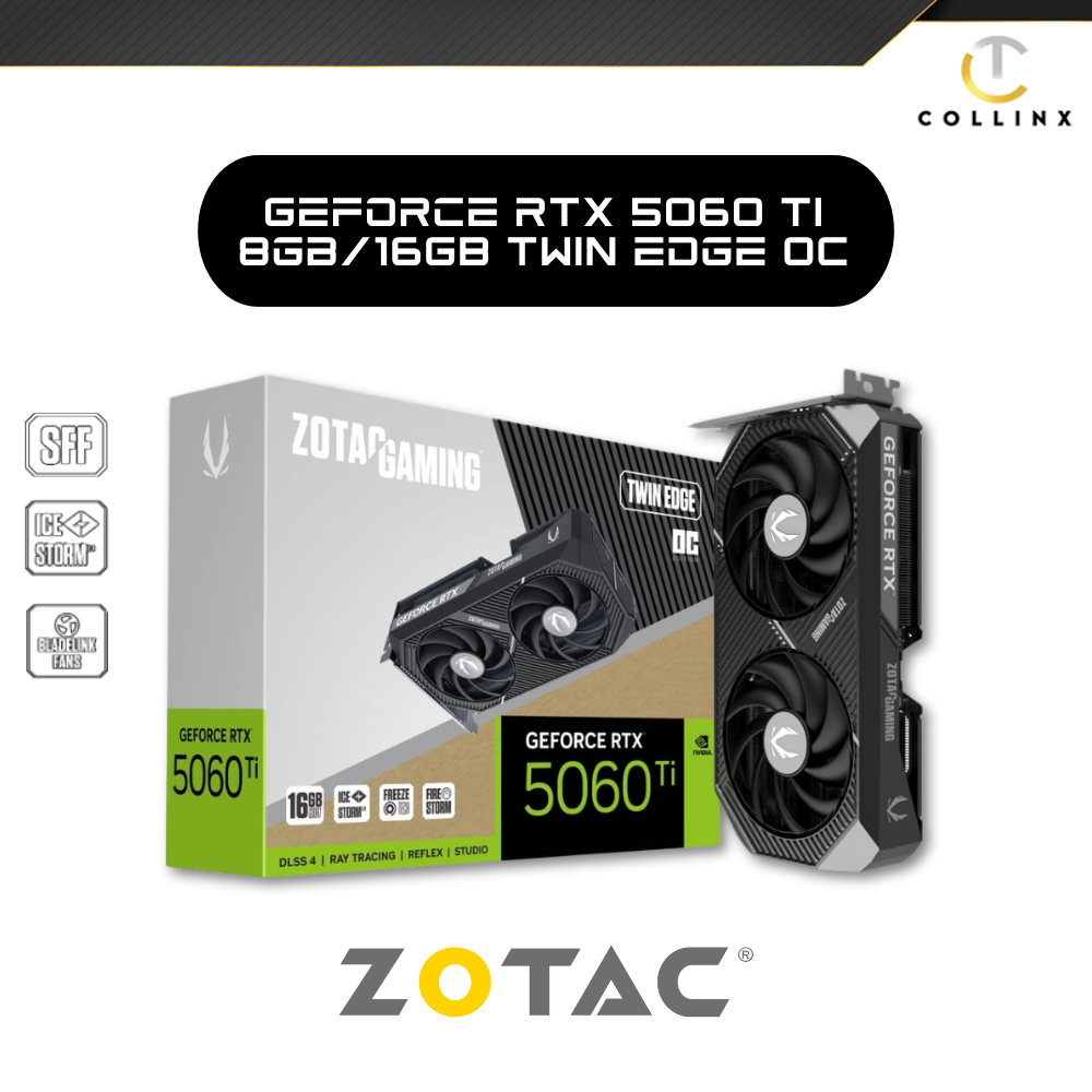 The ZOTAC GAMING GeForce RTX 5060 Ti 16GB Twin Edge OC is a compact graphics card powered by NVIDIA‘s cutting edge Blackwell Architecture, DLSS4 and 16GB of GDDR7 memory. With a factory OC as well as a solid cooling solution, the Twin Edge OC is ready to take on the latest title releases with smooth framerates and performance.