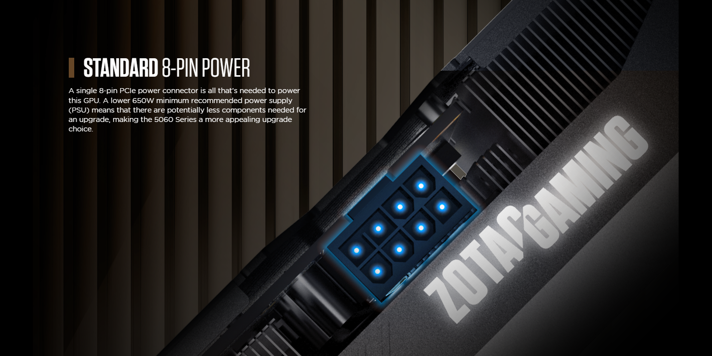 The ZOTAC GAMING GeForce RTX 5060 Ti 8GB Twin Edge OC is a compact graphics card powered by NVIDIA‘s cutting edge Blackwell Architecture, DLSS4 and 8GB of GDDR7 memory. With a factory OC as well as a solid cooling solution, the Twin Edge OC is ready to take on the latest title releases with smooth framerates and performance.